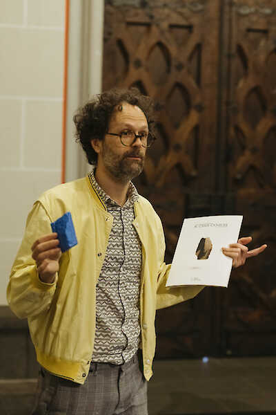 2014 nahm der ESA-Astronaut Alexander Gerst ein Steinfragment aus dem Strebewerk der Südseite des Kölner Doms mit auf seinen Flug ins All zur Internationalen Raumstation ISS. Die außergewöhnliche Reise des Steines und seine Rückkehr zum Kölner Dom wurde pressewirksam dokumentiert und mit großer medialer Aufmerksamkeit begleitet. Heute befindet er sich im Dombauarchiv, wo er in einer Vitrine im Foyer nur noch Besucher:innen der Dombauverwaltung zugänglich ist. Unter Aneignung archivischer Arbeitsweisen wird Andrés Galeano zum neuen Biografen des Domsteins. Mithilfe der Fotografie als wissenschaftlichem Medium schreibt er eine detaillierte Lebensgeschichte des auratischen Einzelobjekts, die ebenso ernst wie amüsiert auf den eigenen Untersuchungsgegenstand blickt.