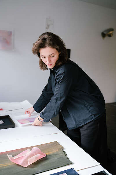 "Um ein Beispiel zu nennen: Der Transferprint von der Fotografie auf das Material der Glyzerinseife. Hier interessiert mich vor allem die Materialität der Glyzerinseife, die wie eine Art Hautschicht ist oder so auch hautähnliche Eigenschaften hat, die je nach Situation auch schwitzt und sich verformt. Spannend ist für mich aber auch der Prozess des Transfers selbst. Das Auswaschen und Abziehen des Papiers, das Abdrücken der Pigmentschicht - das, was dann in der Glyzerinseife zurückbleibt und der Moment, wo ich es sozusagen weghalten muss vom Wasser, damit diese Pigmentschicht nicht noch mehr verschwindet. Also dieser interessante performative Moment: “Wann verschwindet etwas?” oder „Wie viel kann ich kontrollieren, damit es verschwindet? Und wie viel kann ich es aber auch einfach dem Zufall überlassen?".