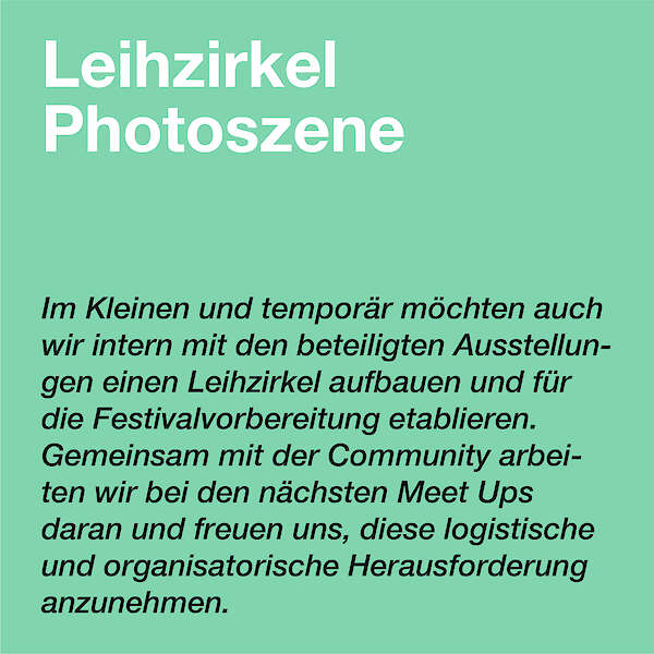 Im Kleinen und temporär möchten auch wir intern mit den beteiligten Ausstellungen einen Leihzirkel aufbauen und für die Festivalvorbereitung etablieren. Gemeinsam mit der Community arbeiten wir bei den nächsten Meet Ups daran und freuen uns, diese logistische und organisatorische Herausforderung anzunehmen. Denn es gibt sicherlich viele Gegenstände, die für die ein oder andere vergangene Ausstellung besorgt wurden und nicht mehr gebraucht werden, dafür aber für andere nützlich sein können.
