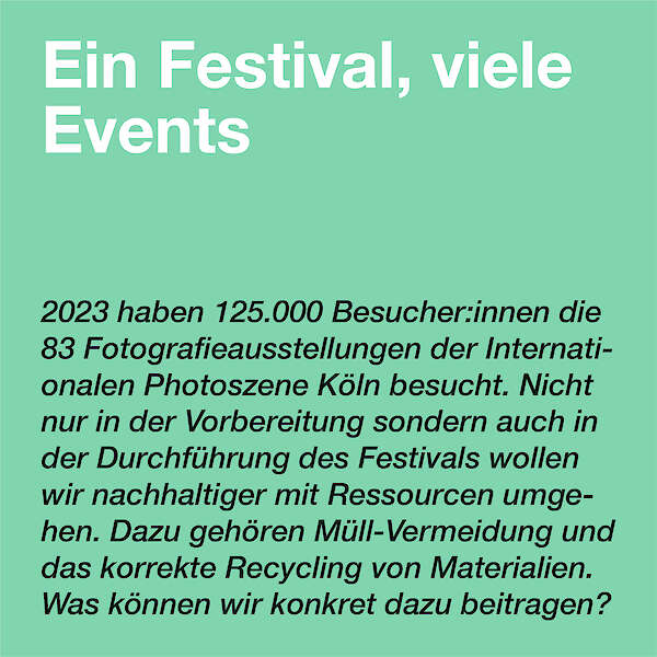 2023 haben 125.000 Besucher:innen die 83 Fotografieausstellungen der Internationalen Photoszene Köln besucht. Nicht nur in der Vorbereitung sondern auch in der Durchführung des Festivals wollen wir nachhaltiger mit Ressourcen umgehen. Dazu gehören Müll-Vermeidung und das korrekte Recycling von Materialien. Was können wir konkret dazu beitragen?