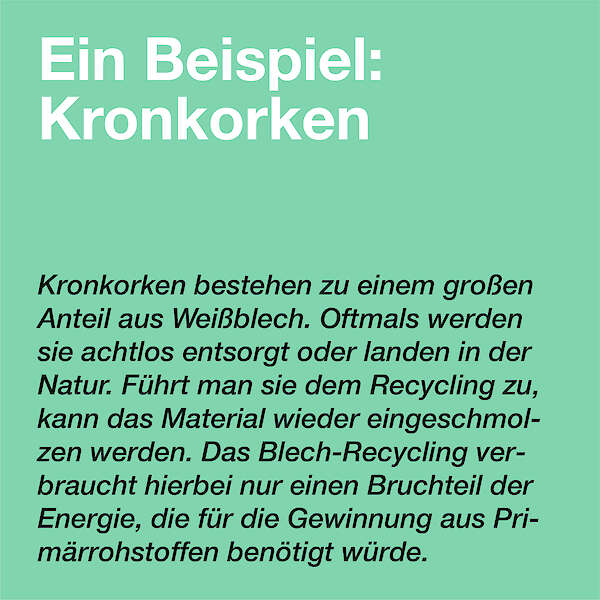 Kronkorken bestehen zu einem großen Anteil aus Weißblech. Oftmals werden sie achtlos entsorgt oder landen in der Natur. Führt man sie dem Recycling zu, kann das Material wieder eingeschmolzen werden. Das Blech-Recycling verbraucht hierbei nur einen Bruchteil der Energie, die für die Gewinnung aus Primärrohstoffen benötigt würde.