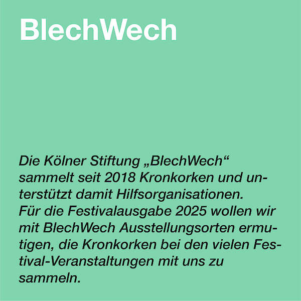 Die Kölner Stiftung „BlechWech“ sammelt seit 2018 Kronkorken und unterstützt damit Hilfsorganisationen.Für die Festivalausgabe 2025 wollen wir mit BlechWech Ausstellungsorten ermutigen, die Kronkorken bei den vielen Festival-Veranstaltungen mit uns zu sammeln.