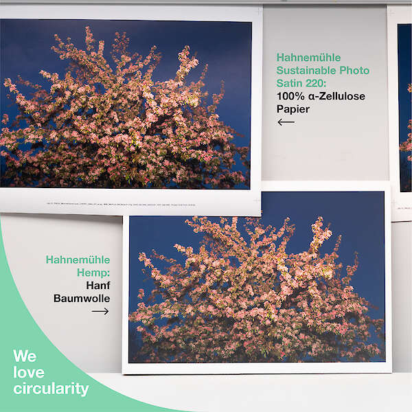 - Hahnemühle Sustainable Photo Satin 220: 100% α-Zellulose Papier