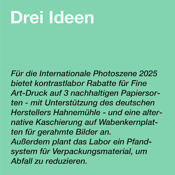 Für die Internationale Photoszene 2025 bietet kontrastlabor Rabatte für Fine Art-Druck auf 3 nachhaltigen Papiersorten - mit Unterstützung des deutschen Herstellers Hahnemühle - und eine alternative Kaschierung auf Wabenkernplatten für gerahmte Bilder an.Außerdem plant das Labor ein Pfandsystem für Verpackungsmaterial, um Abfall zu reduzieren.