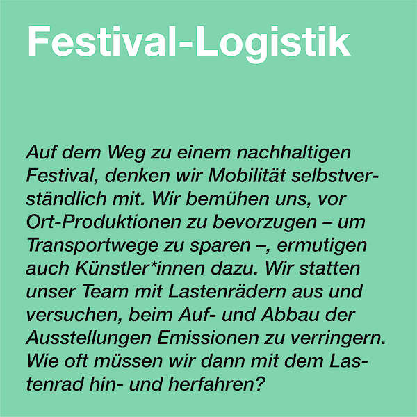 Auf dem Weg zu einem nachhaltigen Festival, denken wir Mobilität selbstverständlich mit. Wir bemühen uns, vor Ort-Produktionen zu bevorzugen – um Transportwege zu sparen –, unterstützen und ermutigen auch Künstler*innen dazu. Wir statten unser Team mit Lastenrädern aus und versuchen, beim Auf- und Abbau der Ausstellungen Emissionen zu verringern bzw. zu vermeiden. Wie oft müssen wir dann mit dem Lastenrad hin- und herfahren?