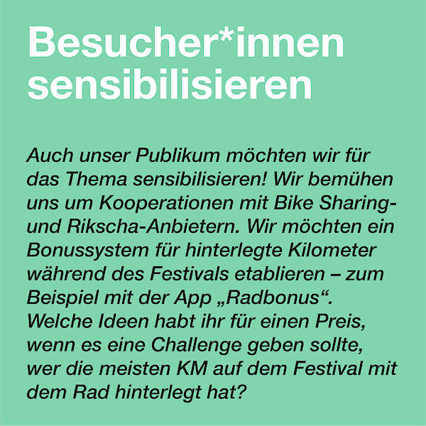 Auch unser Publikum möchten wir für das Thema sensibilisieren und gewinnen! Wir bemühen uns um Kooperationen mit Bike Sharing- und Rikscha-Anbietern. Wir möchten ein Bonussystem für hinterlegte Kilometer während des Festivals etablieren – zum Beispiel mit der App „Radbonus“.