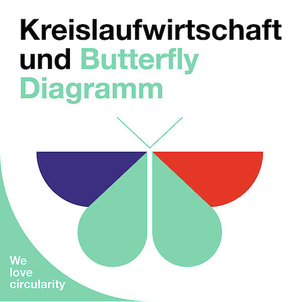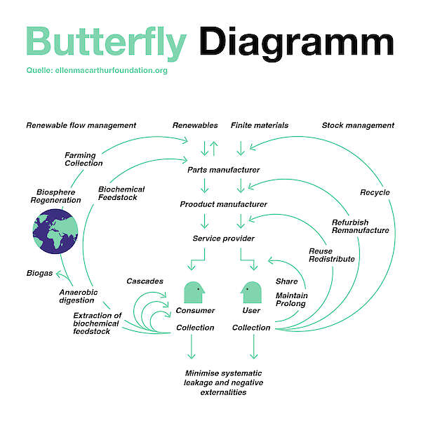 Das Butterfly-Diagramm verbildlicht die Idee einer Kreislaufwirtschaft, in der von Anfang an die Intensivierung der Nutzungsdauer und die Wiederverwertbarkeit der Materialien mitgedacht wird.