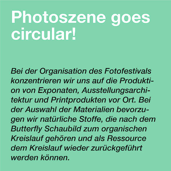 Die Internationale Photoszene Köln hat sich für die Festivalausgabe 2025 zum Ziel gesetzt, die Umweltauswirkungen seiner Ausstellungspraxis, seiner Festivalorganisation und seines Publikums so gering wie möglich zu halten und die Idee einer Kreislaufwirtschaft für die Kultur ins Bewusstsein zu bringen.