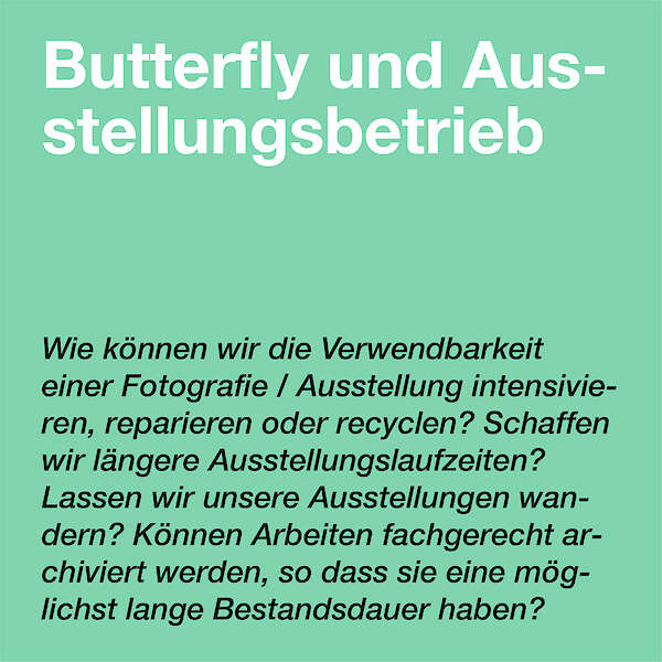 Bereits bei der Auswahl der Materialien können wir wichtige nachhaltige Prozesse anstoßen, indem wir beispielsweise bei der Gestaltung von temporären Räumen natürliche Stoffe einsetzen. Dem Butterfly Schaubild der Ellen Mc Arthur Foundation nach gibt es den organischen und den technischen Kreislauf. Temporäre Ausstellungsformate wie Fotofestivals ohne eigene Räumlichkeiten haben oft kein eigenes Depot, Fundus oder Materiallager.