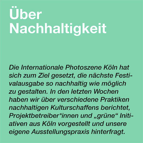 In den kommenden Wochen wird die Online Präsenz der Photoszene über die Website und die Sozialen Medien über verschiedene Praktiken nachhaltigen Kulturschaffens berichten, Projektbetreiber*innen und „grüne" Initiativen aus Köln treffen und diese vorstellen: