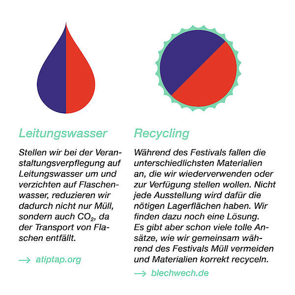 Während des Festivals fallen die unterschiedlichsten Materialien an, die wir wiederverwenden oder zur Verfügung stellen wollen. Nicht jede Ausstellung wird dafür die nötigen Lagerflächen haben. Wir finden dazu noch eine Lösung. Es gibt aber schon viele tolle Ansätze, wie wir gemeinsam während des Festivals Müll vermeiden und Materialien korrekt recyceln.