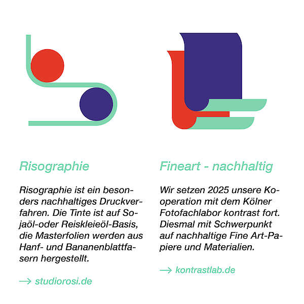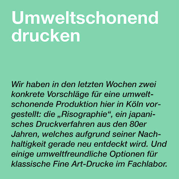 Wir haben in den letzten Wochen zwei konkrete Vorschläge für eine umweltschonende Produktion hier in Köln vorgestellt: die „Risographie“, ein japanisches Druckverfahren aus den 80er Jahren, welches aufgrund seiner Nachhaltigkeit gerade neu entdeckt wird. Und einige umweltfreundliche Optionen für klassische Fine Art-Drucke im Fachlabor.