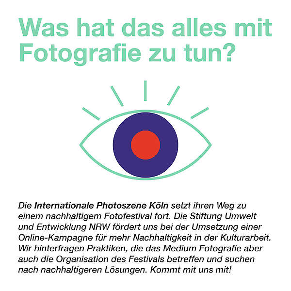 Die Internationale Photoszene Köln setzt ihren Weg zu einem nachhaltigen Fotofestival fort. Die Stiftung Umwelt und Entwicklung des Landes Nordrhein-Westfalen fördert die Festivalorganisation bei der Umsetzung einer Online-Kampagne für mehr Nachhaltigkeit in der Kulturarbeit.