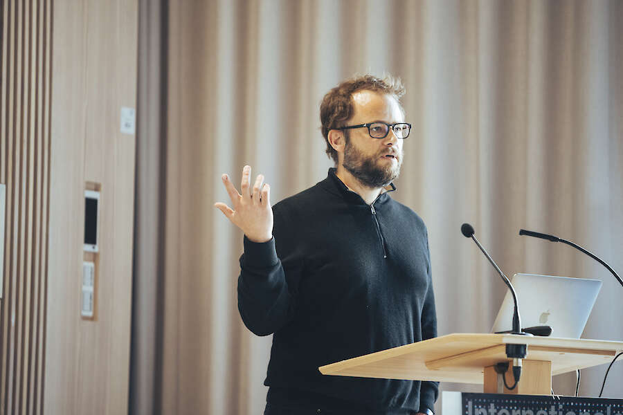 • Pablo Lerma steht hinter einem Tisch vor Besuchenden und spricht in ein Mikro. Vor ihm stehen leere Boxen.  © buerofuerkunstdokumentation