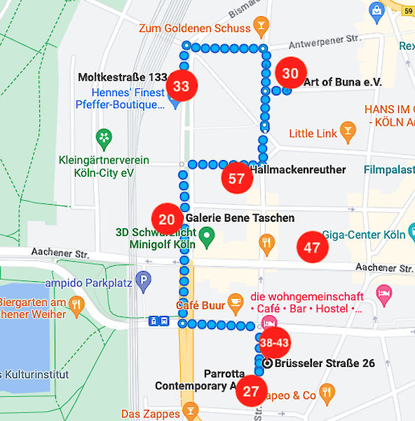 Wie wäre es z.B. mit einem Rundgang durch’s Belgische Viertel? Wir haben eine Route für euch vorbereitet, auf der ihr alle Ausstellungsorte des Viertels findet, ihr pickt euch einfach eure Rosinen raus oder macht mehrere Etappen an unterschiedlichen Tagen draus.