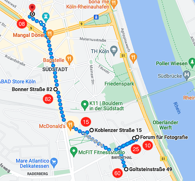 Nr. 22 – Auf dem Weg zur Galerie Julian Sander (Bonner Str. 82) findet ihr auf der Bonner Str. zahlreiche Möglichkeiten für eine kleine Stärkung, bevor ihr euch ca. 40 jüngst wiederentdeckte Vintage-Abzüge von Peter Keetman, einer zentralen Figuren der deutschen Nachkriegsfotografie, anschauen könnt.
